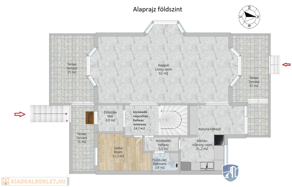 A földszinten egy 63 m2-es nappali található kandallóval, egy nagy gépiesített konyha étkezővel, további egy szobával és egy fürdőszobával. Elől és hátul is nagy terasz lett építve hozzá a szinthez.