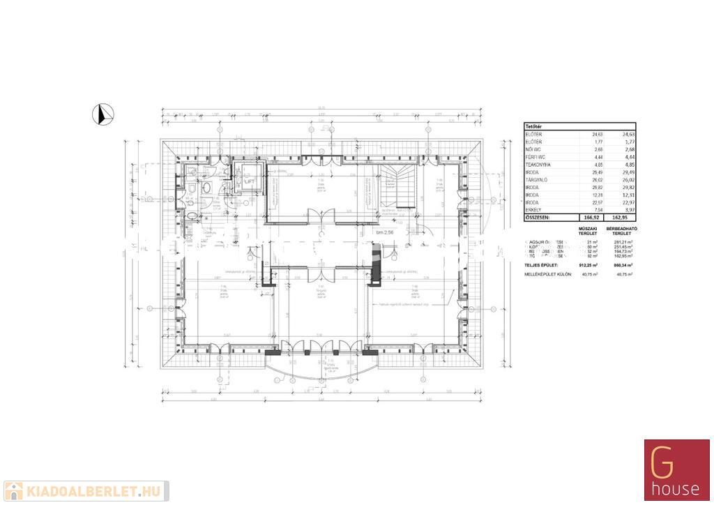2. emelet: 5 iroda, teakonyha, mosdók, erkély,