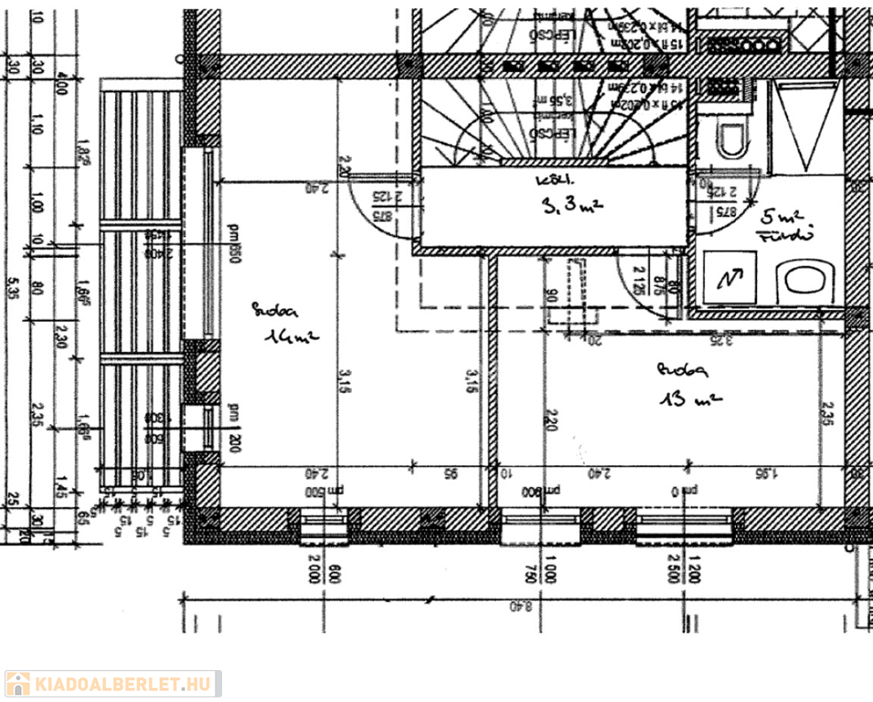 - felső szint: 2 db. szoba, fürdőszoba ( kád, wc, mosdó )