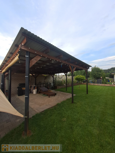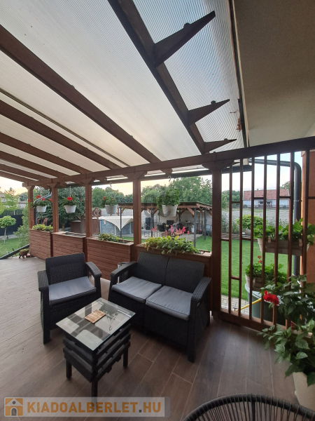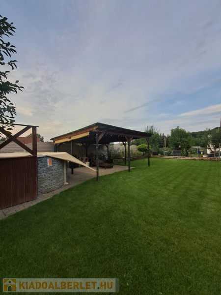 430 m² teljesen parkosított kert automata öntözőrendszerrel , örökzöldekkel, filagóriával, magas ágyással, ellenáramoltatós, hőgenerátoros 3,5 méter átmérőjű, medencével,
