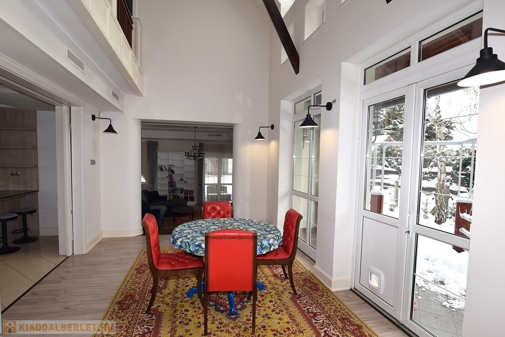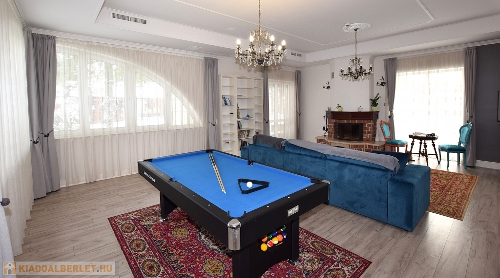 Földszinten található egy tágas nappali kandallóval, biliárdasztallal. Hatalmas étkező-konyha, mely elszeparálható igény szerint. A nappalin kívül van egy szintén tágas szivarszoba, mely használható társalgónak, irodának egyaránt vagy éppen egy külön lakrésznek is.