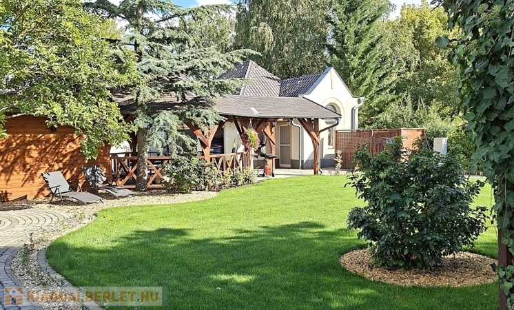 Az udvar öntözőrendszerrel felszerelt, így a sok örökzöld, virág, fű minimális karbantartást igényel. 10-15 növényeket, fákat megvilágító kerti lámpák az esti kerti sétákhoz. Sziklakert és vízköpő egyik és másik végén az udvarnak, hogy garantált legyen a kerti öröm. A kinti grillezőn, sütni kedvelőknek fedett főző rész füstkivezető üsttel. A dupla garázsban (50nm) wc, praktikus monolit födém jó belmagasság padlástér plusz tárolási lehetőség.