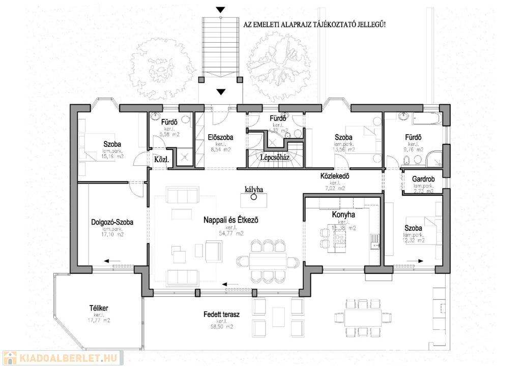 - Emelet: ~170,30 m2 + ~18,00 Télikert + ~58,50 m2 Fedett terasz
