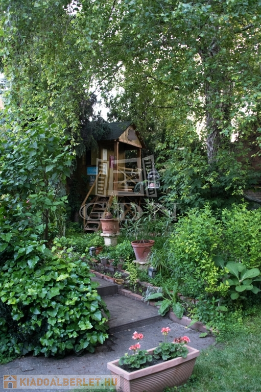 A ház legnagyobb értékes dísze a kert, őspark, mini arborétum. Egy beállt kert, különleges növények, fák, virágok sokasága, pergola, fedett terasz, gyermek játszó-faház, kerti ösvények teszik romantikus hangulatúvá, ahol több helyen van lehetőség pihenésre, főzésre, szabadtéri tevékenységekre. A levegő oxigén-dús, és a nyári melegben néhány fokkal alacsonyabb a hőmérséklet a telken, klímára nincs is szükség.