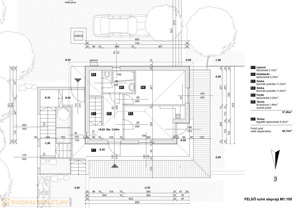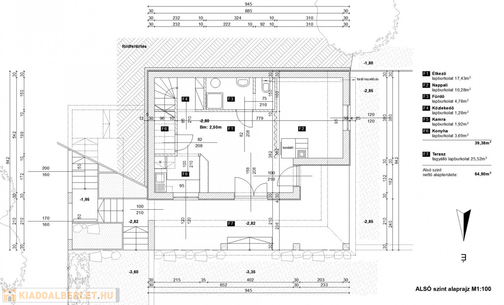 - helyiségek alsó szinten: közlekedő, konyha, étkező, nappali + terasz kapcsolattal, wc, fürdőszoba,