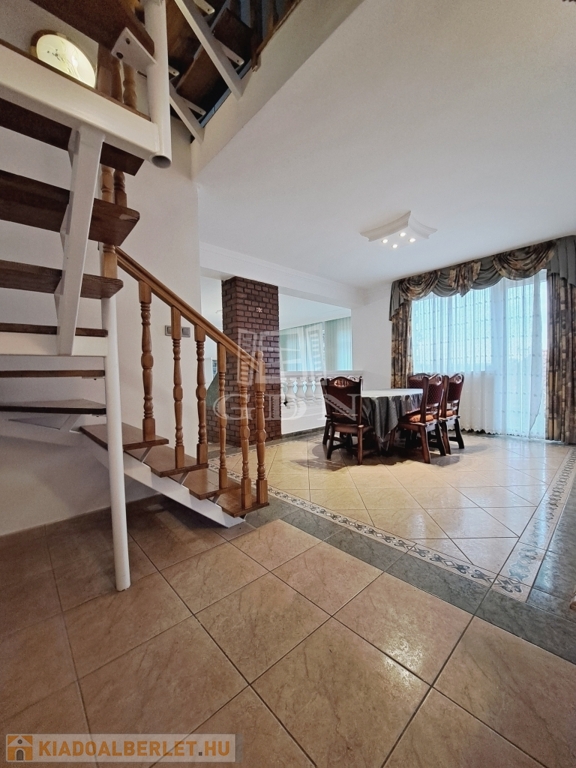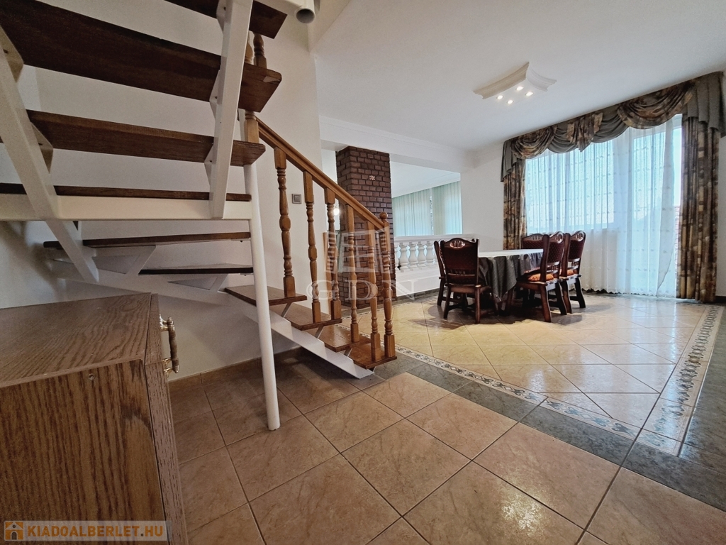 MISKOLCTAPOLCA csendes, kertvárosi részén az Ungvári utcában, hosszútávra kiadó egy igényesen berendezett, 190 m2-es, nappali-konyha ebédlő + 3 hálószobás, tetőtéri szobás, gardróbos, 2 fürdőszobás, 3 wc, külsőleg szigetelt, klímás, belső 3 szintes, kertes családi ház.