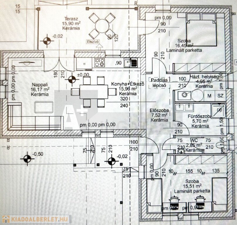 A ház központi tere a tágas nappali amerikai konyhával és étkezővel, melyből közvetlen kijárat nyílik a 15,9 m²-es fedett teraszra.