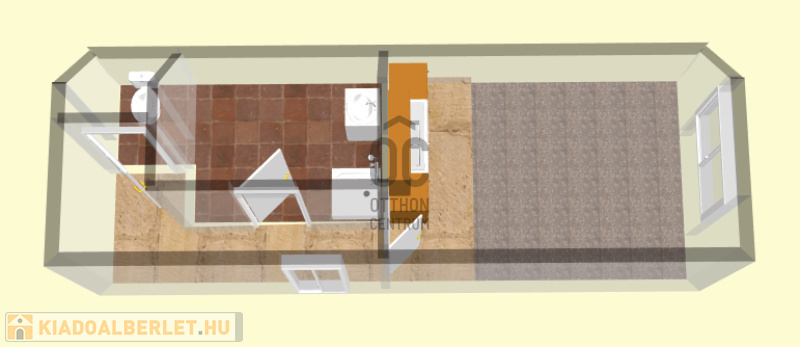 A lakásban szoba-konyha egyben található, a főzés infra főzőlappal megoldott, hűtőszekrény rendelkezésre áll.