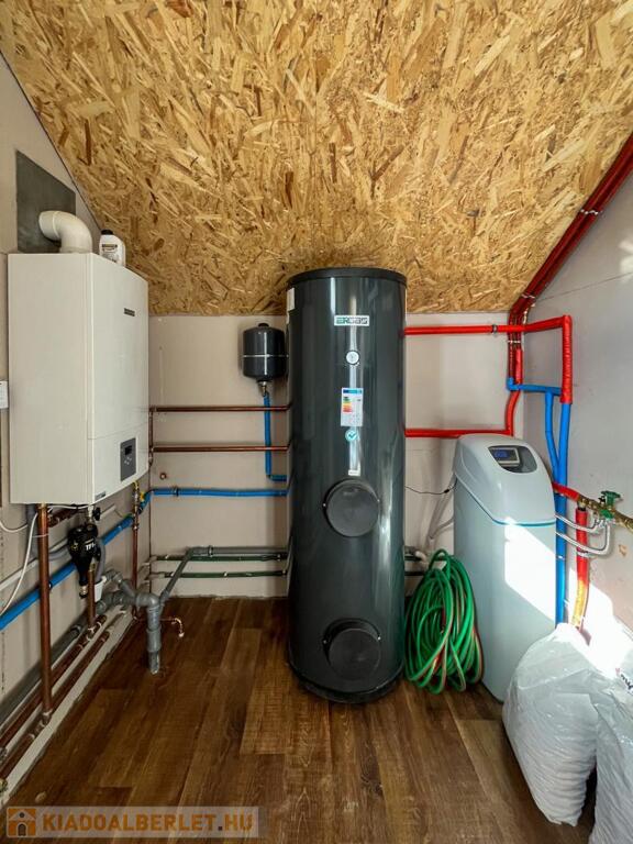 A ház fűtéséről egy kondenzációs gázkazán gondoskodik radiátoros hőleadással, melyet hamarosan fa tüzelésű kandalló egészít ki – nemcsak hangulatos, hanem hatékony kiegészítő fűtés is lesz.
