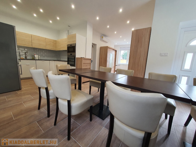Kiadó Vecsés , kertvárosi részén 2018-ban teljesen felújított, 200 nm-es kétszintes családi ház, önálló kertrésszel. Nappali+ 5 szobás, szobánként saját fürdőszobával.Nagy közös nappali, konyha ebédlővel, rendezett kerttel. A kertben van egy melléképület, ahol egy raktár és egy mosókonyha van kialakítva. Gépesített, jól felszerelt konyha, minden szoba légkondicionált, bútorozott, tv-vel felszerelt, fűtése gáz-cirkóval megoldott. Kertben fedett 2 autós beálló. A kerten belül még 2 autónak van parkolási lehetőség.