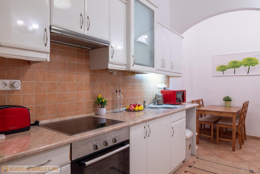 Külön konyha étkezővel, modern beépített bútorokkal, teljesen gépesítve (hűtő, sütő, főzőlap, mikró stb.).