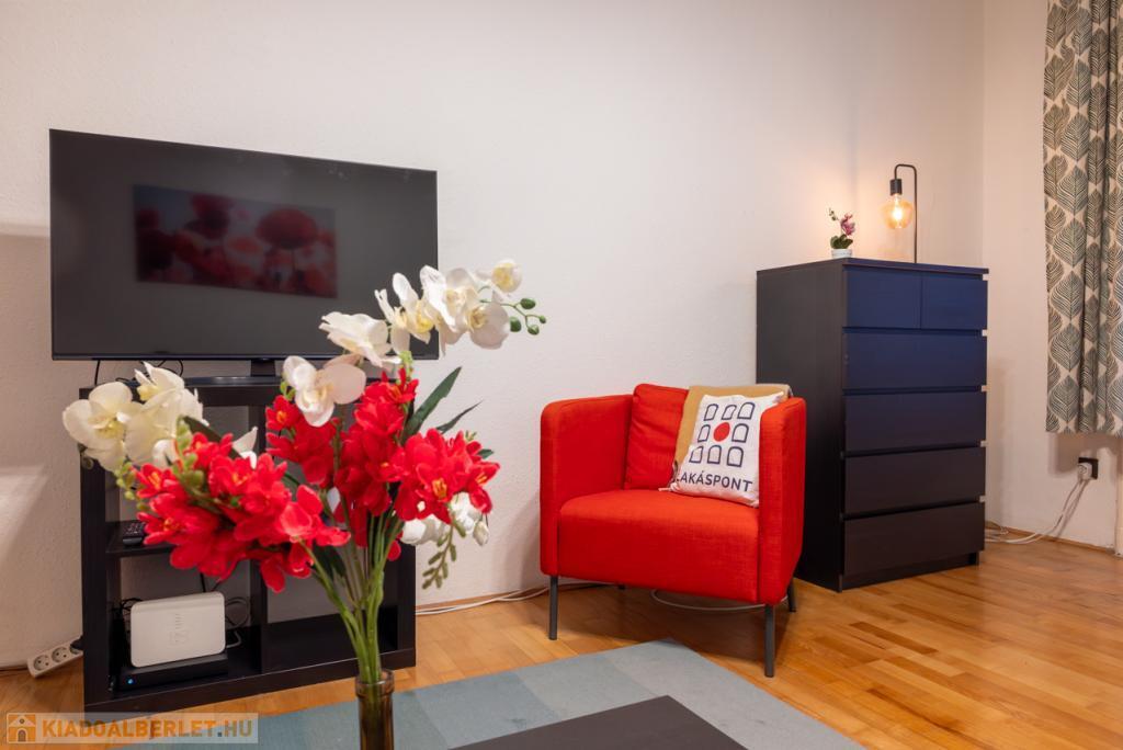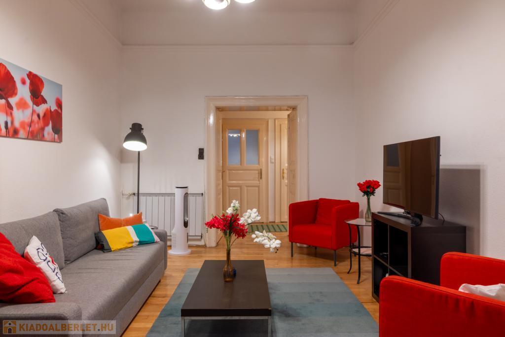 Kiadó Budapest Belvárosában a Hajós utcában, az Operára néző 54 m-es, igényesen berendezett, nappali + 1 hálószobás lakás, június 1-től, rendezett, liftes ház 1. emeletén. RÖVID és HOSSZÚ távra is.
