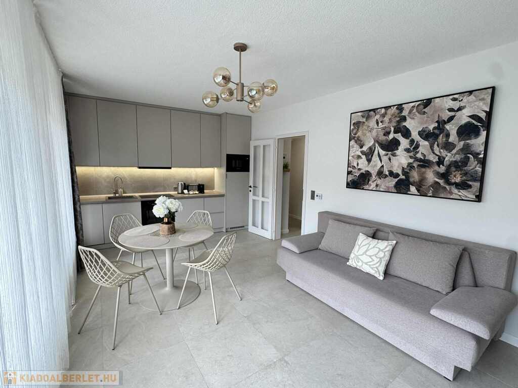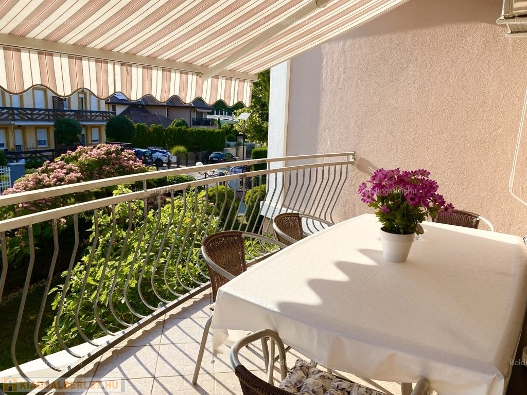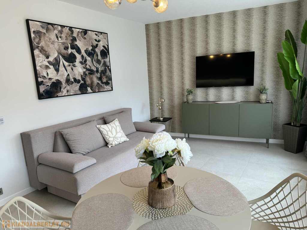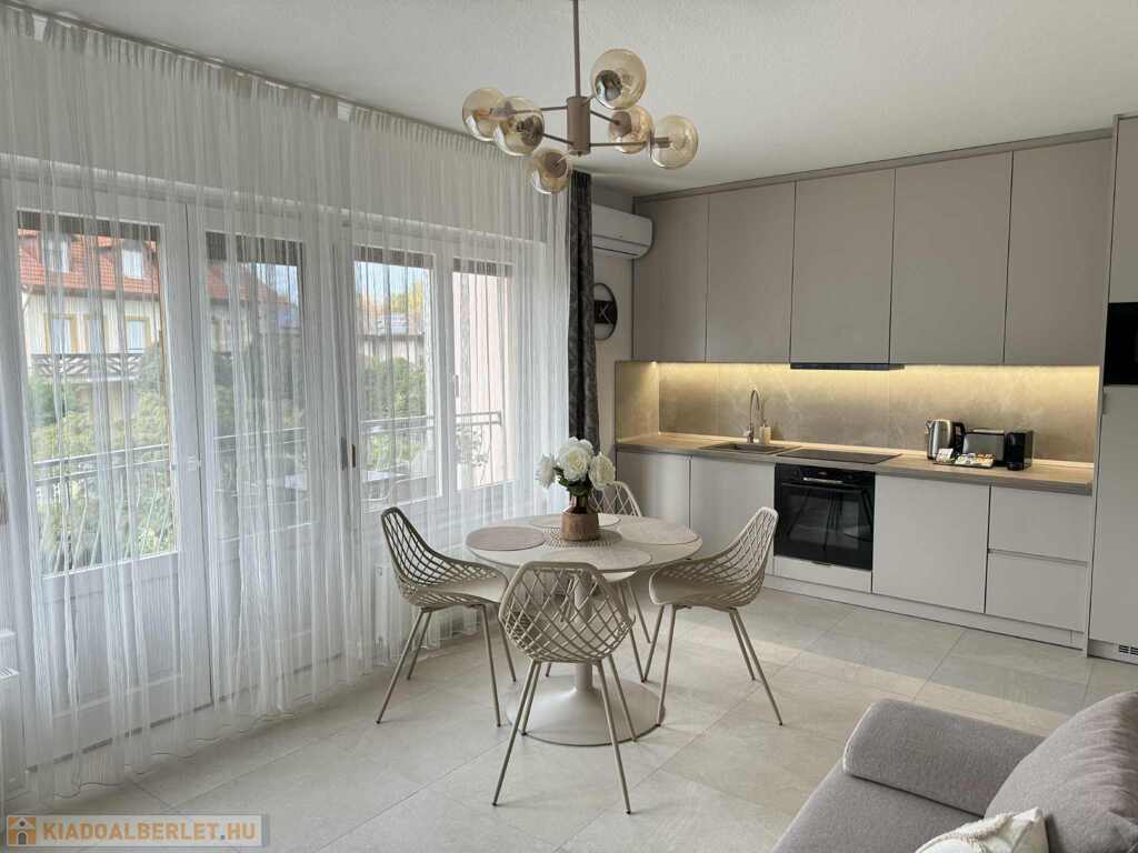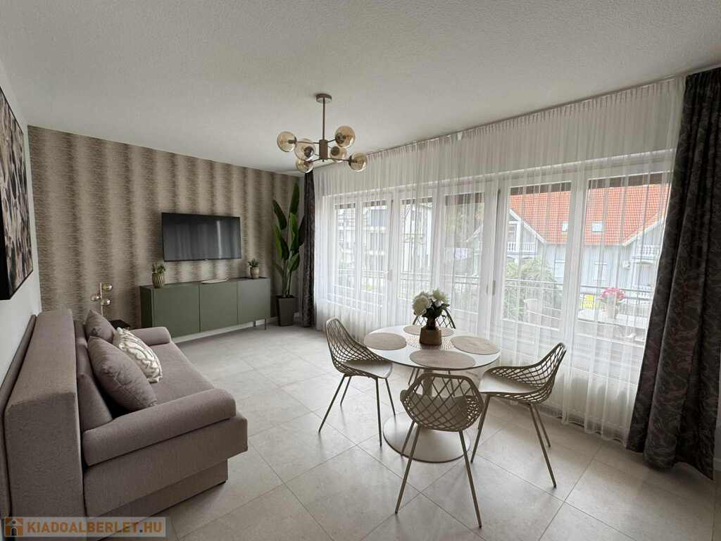 2026.06.15.-ig!!! Balatonlelle központjában, a Balaton parttól 100 m-re, gyönyörű zöldövezeti környezetben rendezett társasház 1. emeletén lévő 51 m2-es felújított iényes lakás kiadó. A lakásban egy szoba + amerikai konyhás nappali amelyből 10 m2-es terasz nyílik, előszoba, fürdőszoba-zuhanyzó-wc helyiségek találhatóak, a fűtése és a melegvíz ellátása kombi gázkazánnal megoldott, továbbá légkondícionáló is van felszerelve, valamint tartozik hozzá az épület zárt udvarában 1 szgk. részére beállóhely is. A lakás teljesen felszerelt, wifi és mindig tv van! A lakást a tulajdonosa legfeljebb 2 felnőtt részére kívánja kiadni, a dohányzás és a kisállat tartása nem engedélyezett! Bérleti díj: 140.000.- Ft/hó + rezsi + 2 havi kaució