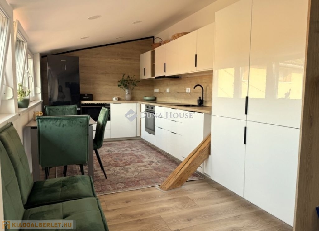 Az igényes konyha és étkező a modern eleganciát ötvözi a praktikummal, míg a látványos faldekorációk és a látható gerendák egyedülálló karaktert adnak a térnek.