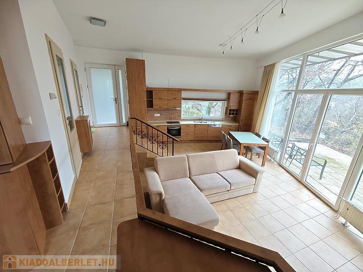 Zöldmálon zsákutcában, erdő szomszédságában kiadó egy kevés lakásos újszerű társasházban egy 1,5 szobás, nagy teraszos, közvetlen kertkapcsolatos lakás. Bútorozott, gépesített konyhával, házközponti fűtés egyedi méréssel (padlófűtés és radiátoros hőleadókkal), hatalmas ablakokkal.