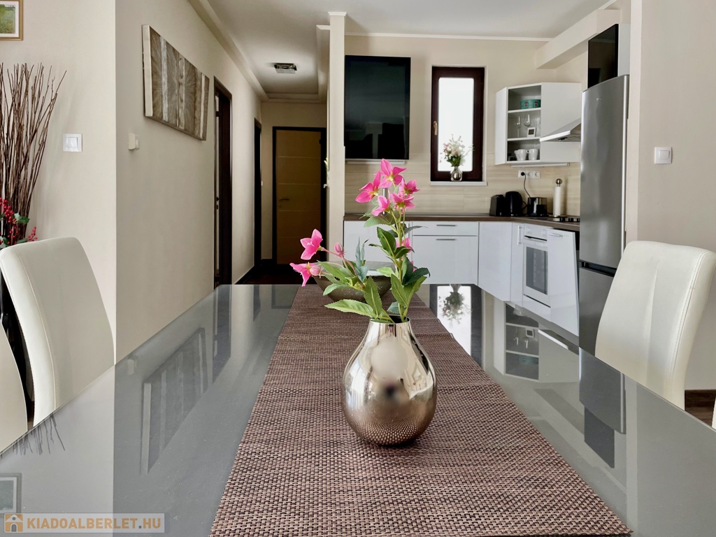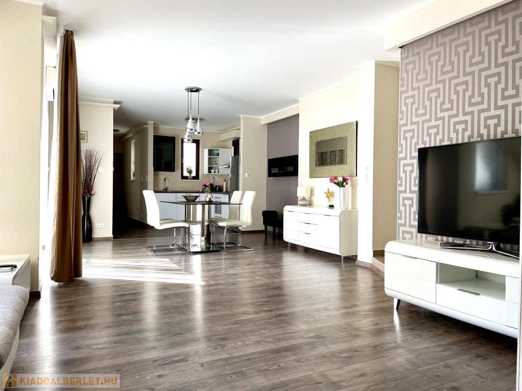 A lakás teljeskörűen berendezett és gépesített, minimál design és magas minőségű kivitelezés jellemzi.