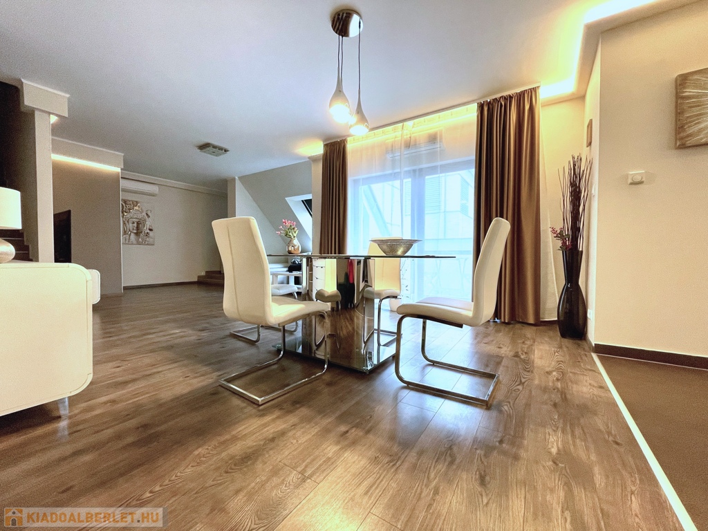 For rent: a spacious, 130 m², two-level luxury apartment located in District II, Erőd Street, in a modern building with a new elevator, built through a 2014 rooftop extension.