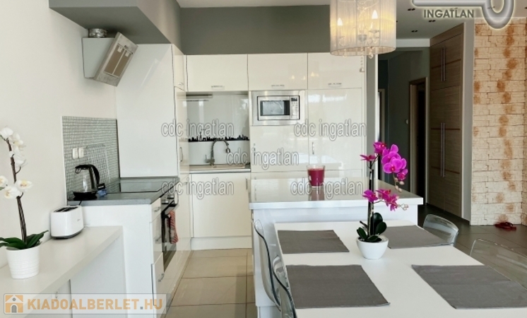 II. kerületben, Csatárka és Pálvölgy határában egy kisforgalmú, csendes utcában kiadó egy kis lakóközösségű társasház első emeleti lakása. Luxus minőségben felújított, világos, jó hangulatú, minőségi konyhával, ízlésesen berendezett. A 95 m2-es, nappali + 2 hálószobás, teraszos ingatlan rendkívül jó beosztású. A hálószobák külön nyílnak, az amerikai konyhás nappalihoz tartozik a 10 m2-es, kertre néző, panorámás terasz. A fürdőszobában kád és zuhanyzó is van, valamint egy wc és egy bidé. Közvetlen mellette van még egy wc kézmosóval. A lakás része még egy ablakos gardróbhelyiség is. Az ingatlan riasztóval ellátott, légkondícionált, fűtése cirkós, a nappali kandallós. A közös használatú kert folyamatosan gondozott, egy rendszeresen tisztított medencével is rendelkezik, melyet a lakók közösen használhatnak, csakúgy, mint a grillezőt. Parkolási lehetőség van a teremgarázsban, a kertben van egy kocsibeálló és még egy a ház előtt is. Az ingatlan minimum 1 évre kiadó, 2 havi kaució szükséges. A rezsi fogyasztás alapján fizetendő, a közös költség 100 Euro. Kisállatot nem lehet hozni, a dohányzás tilos az ingatlanban.