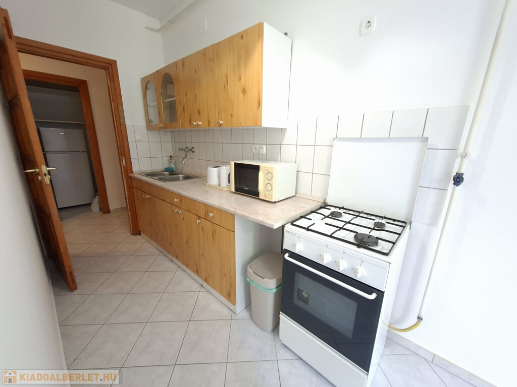 A Liszt Ferenc utcai 42 m2-es tégla építésű lakás szobája és étkező része bútorozatlan, de konyhabútora, nagy gardróbszekrénye és polcozott kamrája van. A társasházi, nagy kertre néző lakás klímával, riasztóval felszerelt és gépesített (gáztűzhely, cirkó, mosógép, kombi hűtő, mikró).