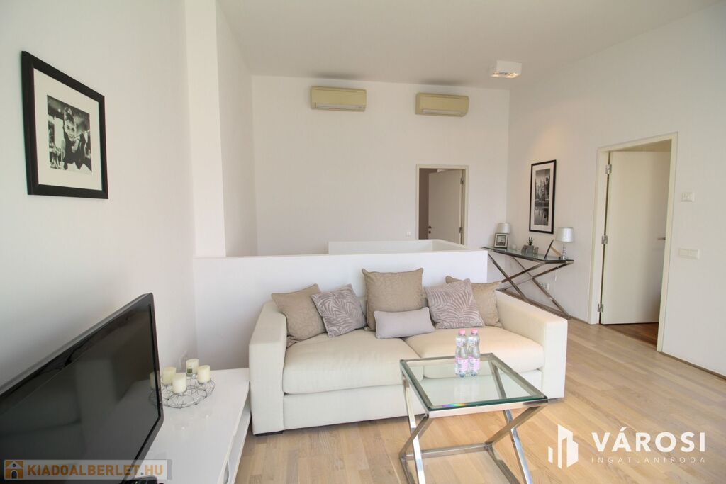 A duplex lakás az épület legfelső, 5. emeletén helyezkedik el, így az üvegplafon varázslatos kilátást enged az égboltra. A 140 m2-en található a bejárati szinten egy tágas és napsütötte amerikai konyhás nappali, egy vendégmosdó és egy tároló helyiség, vagy mosószoba, míg az emeleten van két hálószoba, melyekből külön saját fürdőszoba nyílik (az egyik fürdőkádas, a másik zuhanykabinos), egy panorámás nappali és egy hangulatos erkély. Bútorozottan és gépiesítve várja új bérlőit. A megfelelő hőmérsékletről házközponti fűtés gondoskodik, illetve egyedileg szabályozható fal-, padló-, mennyezetfűtéssel és légkondicionálóval.