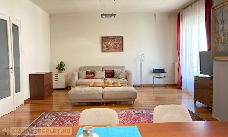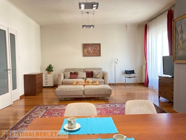 A bright and quiet 83 sqm, 2-room apartment with open-plan kitchen and balcony is available for long-term rent in Budapest’s 5th district, close to the Danube.