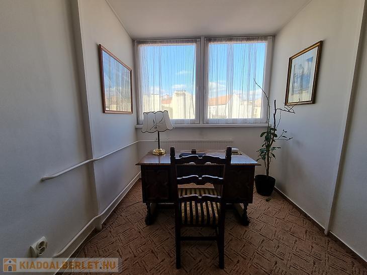 A város szívében, egy a 80-as évek végén épült, nyolcszintes társasház legfelső emeletén kiadó ez a különleges, két lakásból kialakított, impozáns tetőtéri otthon, amely méreteivel és elrendezésével igazi ritkaság a belvárosban.