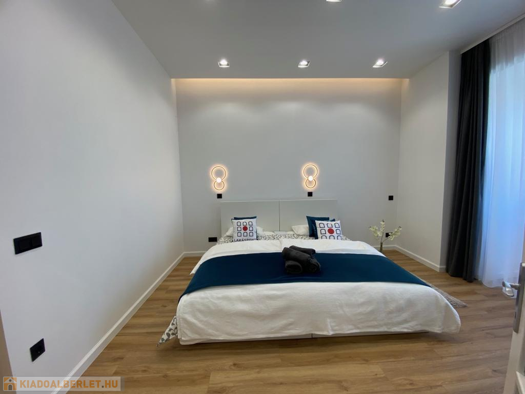 A nappaliból elérhető hálószoba nyugodt, csendes légkört biztosít, a hozzá kapcsolódó, külön gardróbhelyiség pedig praktikus és stílusos megoldás minden igényes bérlő álma.