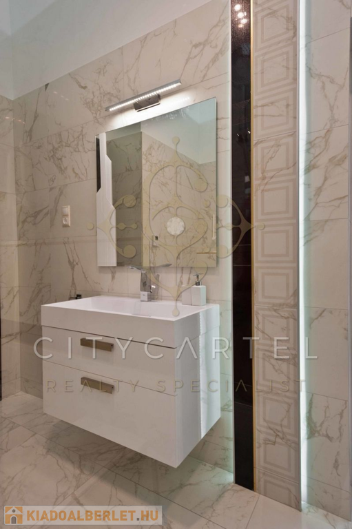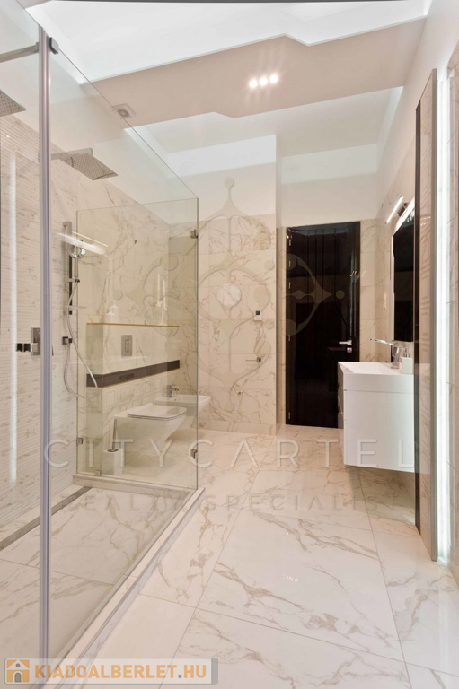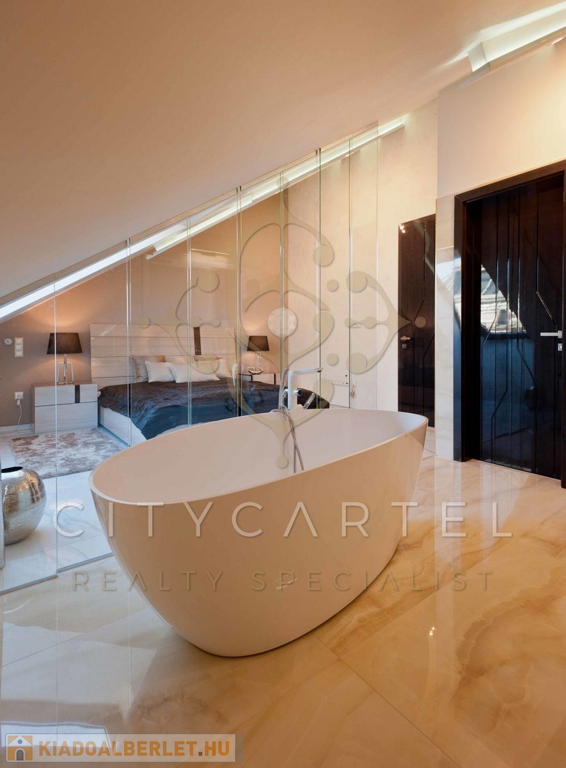 A fürdőszobákban Valentino és La Fabrica burkolatok, valamint Duravit és Grohe szaniterek találhatók. Az egyedi tervezésű bútorok és törölközőszárítók tovább növelik az exkluzivitást, az egyik fürdőszobában pedig egy Ravak hidromasszázs kád biztosítja a pihenés élményét.