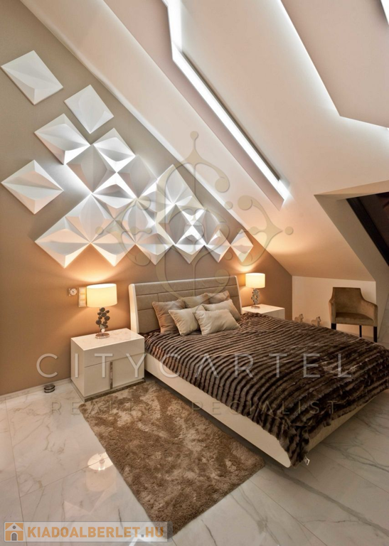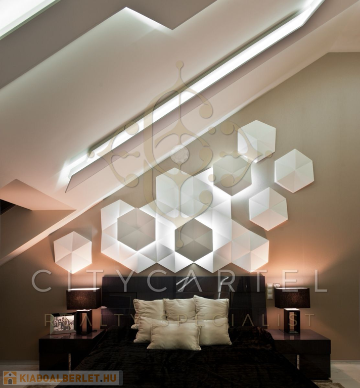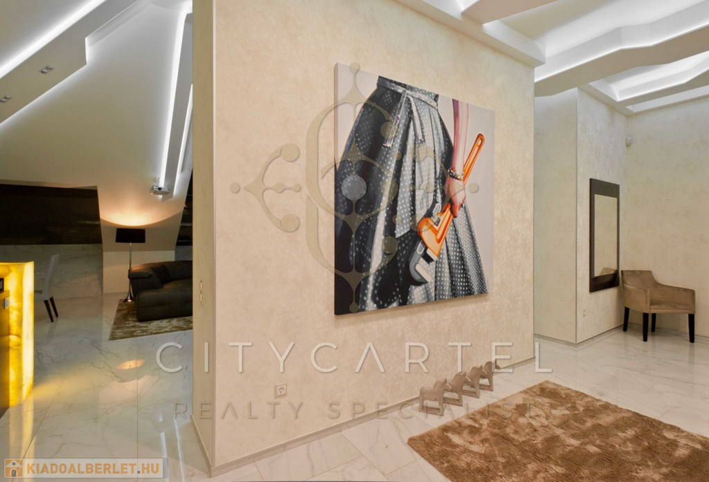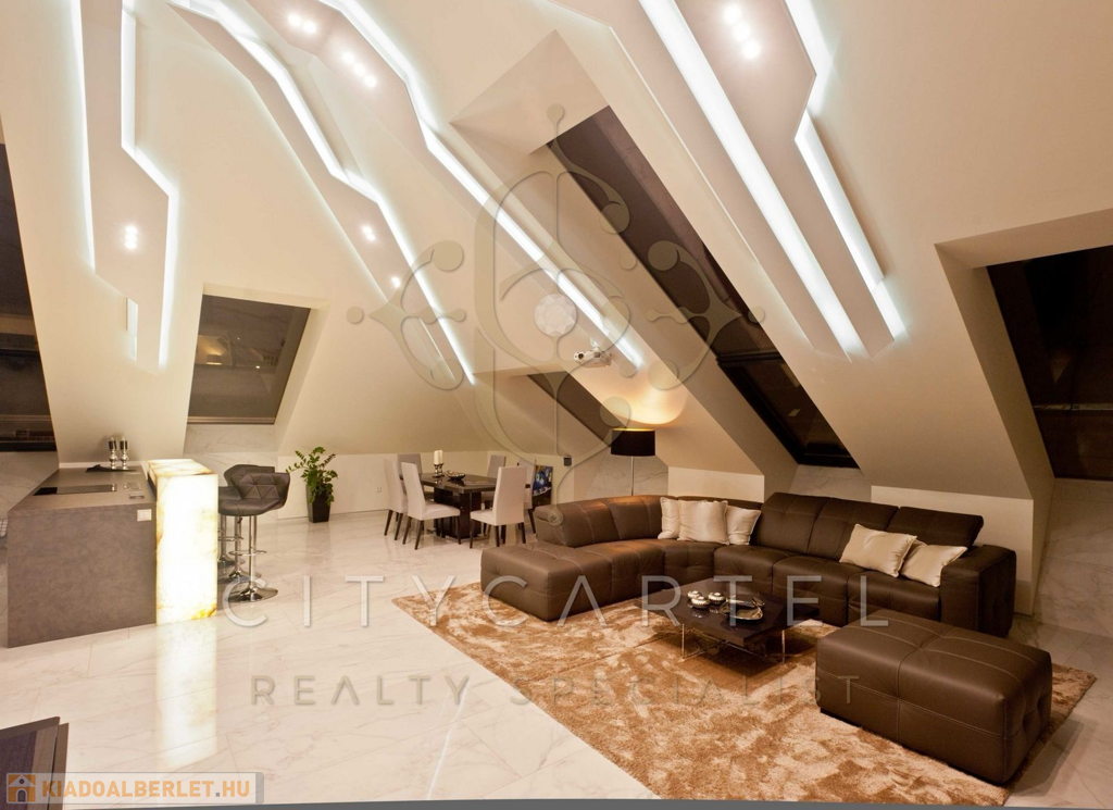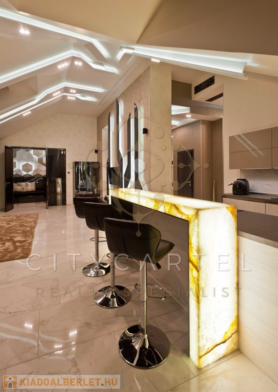 Az egyedi belsőépítészeti megoldások és a gondosan kiválasztott prémium anyagok harmonikus elegyet alkotnak. A LED világítással kombinált faldekorációk és a kézzel készített gipsz mennyezeti díszítések különleges atmoszférát teremtenek. A lakás enteriőrjét olyan neves dizájnmárkák inspirálták, mint a Kare, Bo Concept és Einholtz.