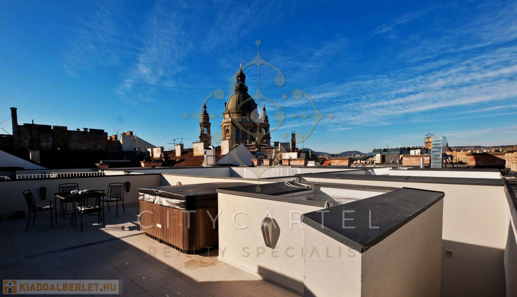 A tetőteraszon egy jakuzzi kapott helyet, amely kiváló lehetőséget kínál a kikapcsolódásra. A közvetlen közelben lévő Szent István-bazilika esti fényei hangulatos környezetet teremtenek.