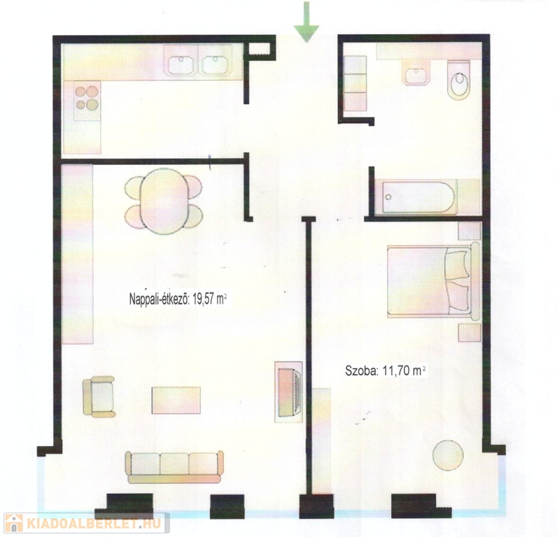 Beosztását tekintve, nappali + 1 szoba, gépesített (elektromos sütő, kerámia főzőlap sütő, elszívó, hűtőszekrény, mini mosogatógép) amerikai konyha, - kádas, mosógéppel is szerelt- fürdőszoba is található az ingatlanban az előszoba mellett.