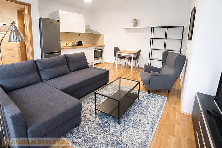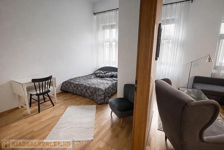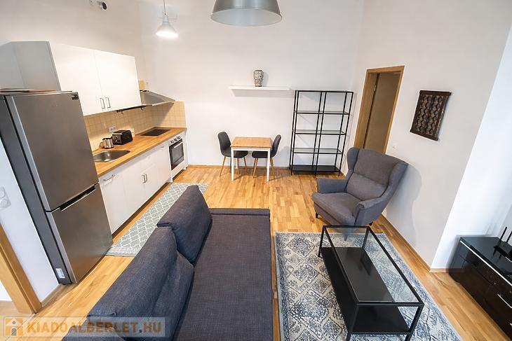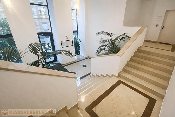 Budapest VI. kerületében, a Vörösmarty utcában, új építésű, modern, portaszolgálatos társasházban kiadó egy 41 m²-es, felújított, világos lakás.