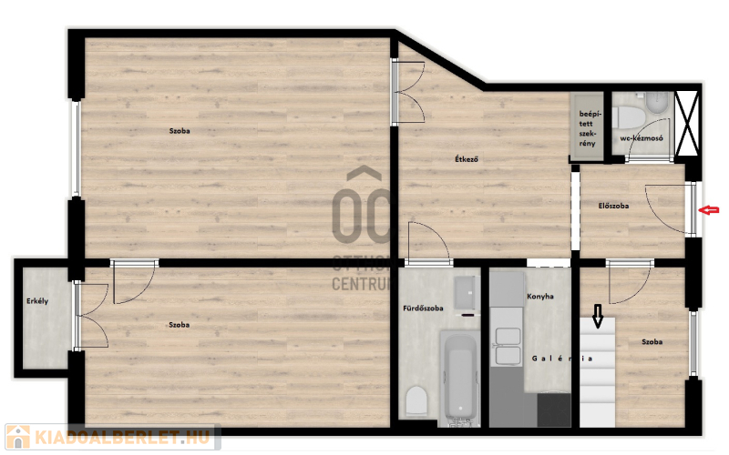 A kisszoba és bejárati rész a függőfolyósó szélesebbik ágára néz. Ez a szoba galériázott. A fekvőgaléria benyúlik a konyha és fürdőszoba fölé, mérete mintegy 3 x 3 m.