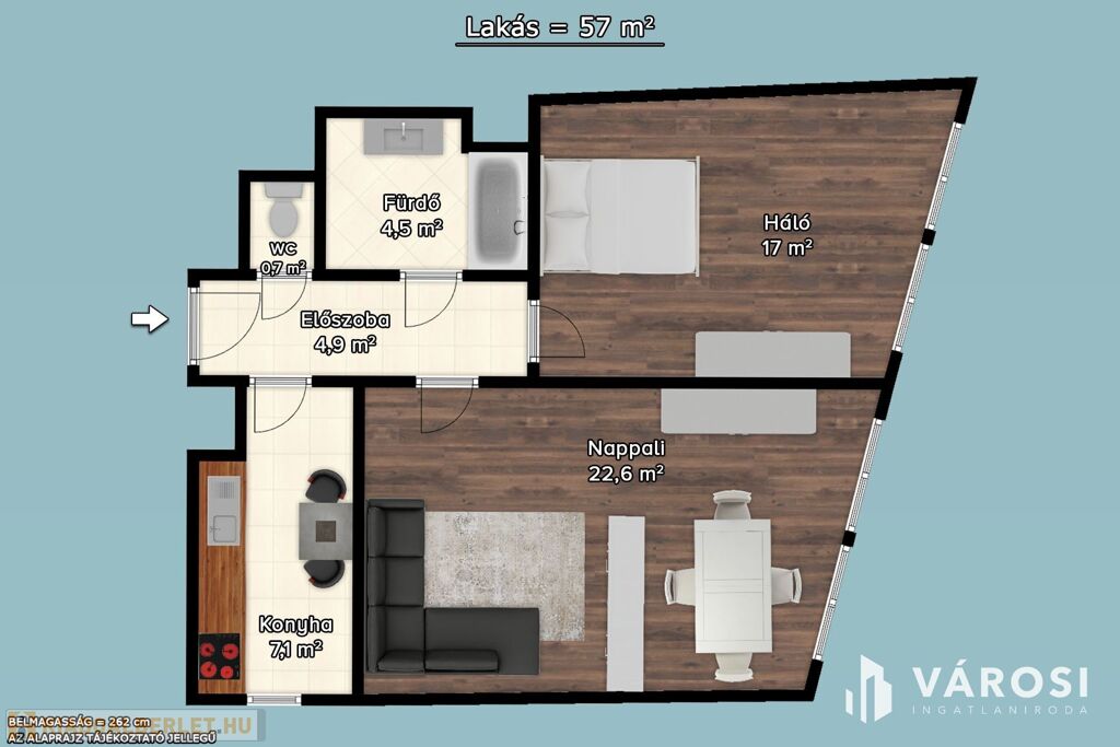 Az ingatlan egy hangulatos nappaliból, tágas hálószobából, egy modern fürdőszobából, különálló WC-ből, valamint ablakos konyhából áll.