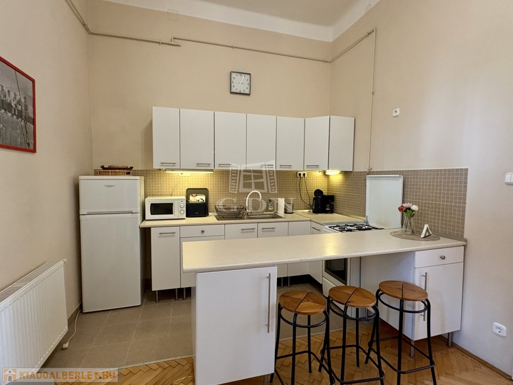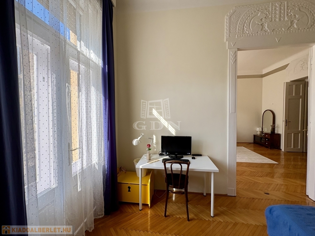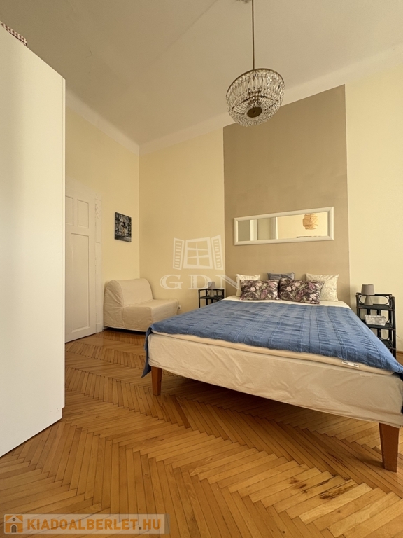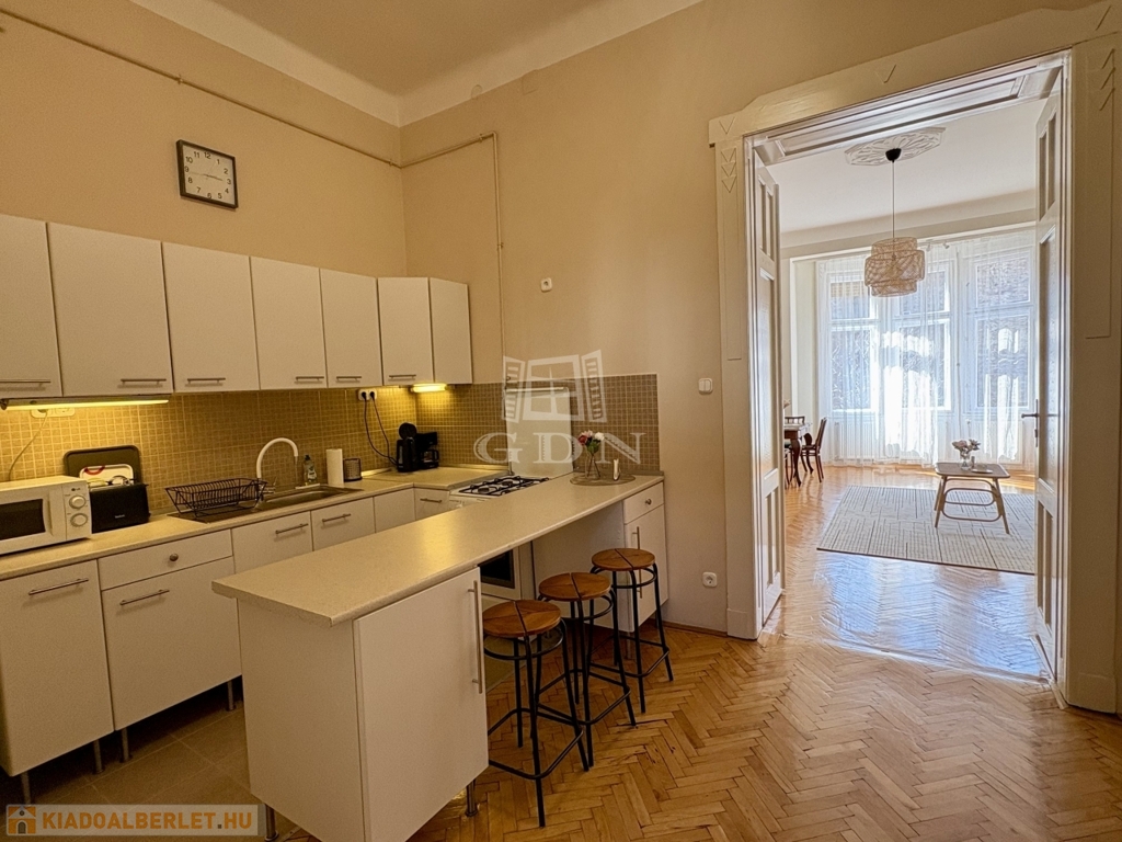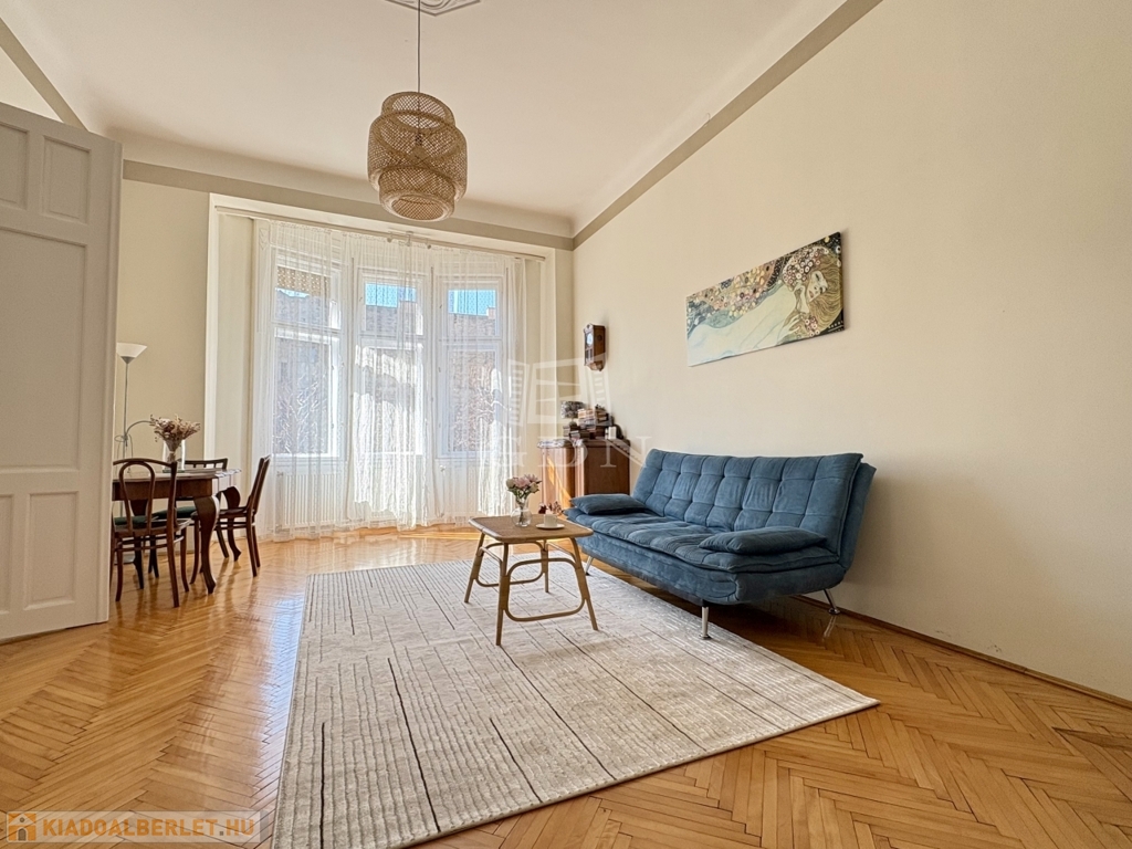Budapest VI. kerületében, az Oktogon és a Nyugati tér közelében hosszú távra kiadó egy 70 m²-es, 2 szobás (nappali + külön hálószobás), világos, erkélyes lakás.
