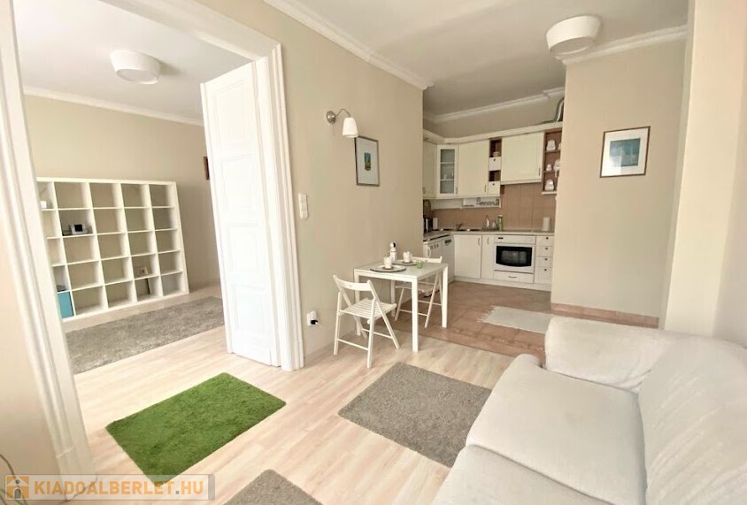 rendezett, liftes, folyamatosan karbantartott ház V.emeletén, egy 65 nm-es, amerikai konyhás nappalis, 2 hálószobás (külön nyílóak) bútorozott, gépesített (mosogatógép, mosógép, hűtő, stb.), belső kertre néző lakás.