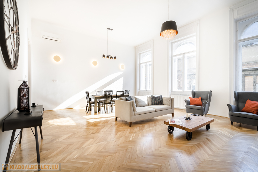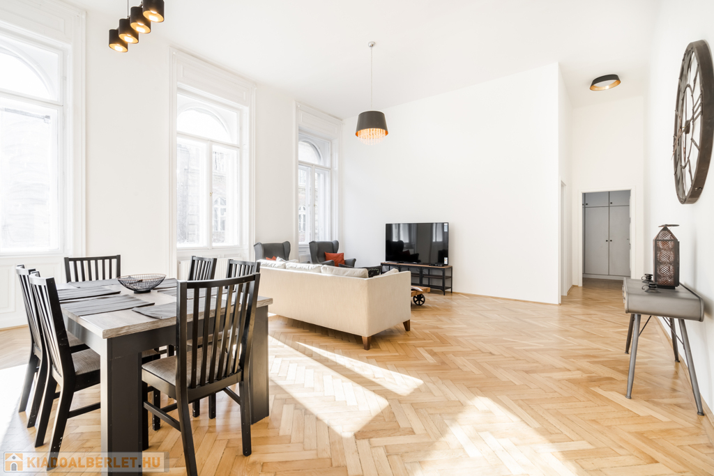 Kiadó tágas, világos, 130 m²-es, teljeskörűen felújított, bútorozott és gépesített lakás a VI. kerületi Teréz körúton.