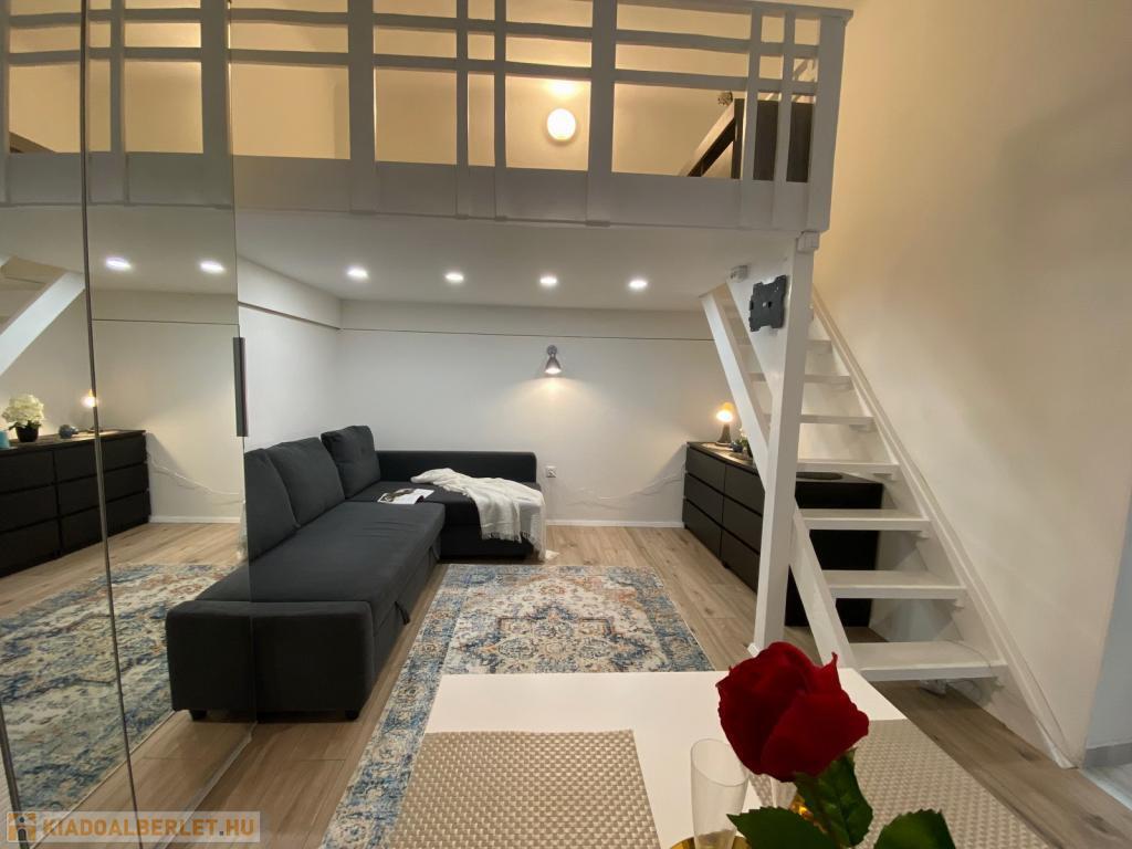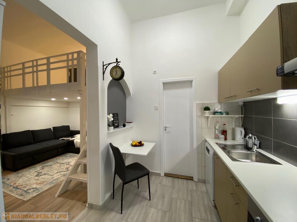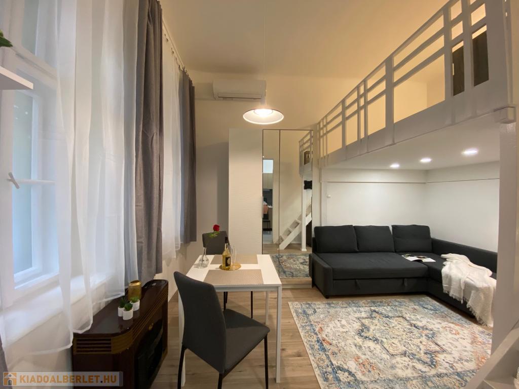 A csendes, belső udvarra néző szoba fiatalosan bútorozott, az alvógaléria pedig extra életteret biztosít, így a lakás tágasabb érzetet kelt. A matrac jelenleg nincs a lakásban, így a leendő bérlő a saját kényelmének megfelelőt hozhatja magával.