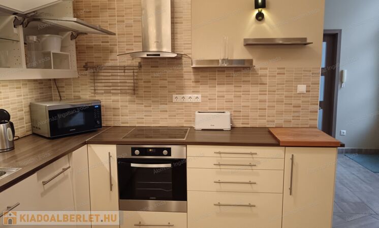 Központi elhelyezkedésű, mégis csendes utcában kiadó egy 50 m²-es, teljesen bútorozott és gépesített, 2 szobás lakás.