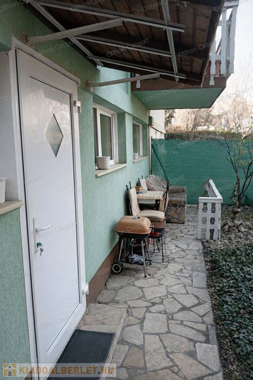 A XI. kerület zöldövezeti, nyugodt részén, Kelenvölgyben kiadó egy 40 m²-es, 1 + 1 fél szobás, bútorozott, gépesített, kertkapcsolatos lakás, családi ház alsó szintjén.