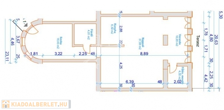 A nappali, konyha és étkező keleti tájolású, kertre néző, innen nyílik a terasz is.