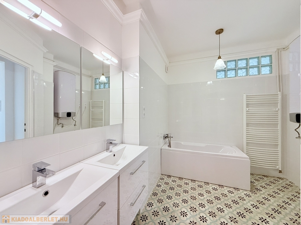 A fürdőszoba kádas kialakítású, törülköző szárítós radiátorral, fiókos szekrényekkel épített mosdókkal felszerelt, ahol a lakás meleg víz ellátását biztosító, új villanybojler is helyet kapott.