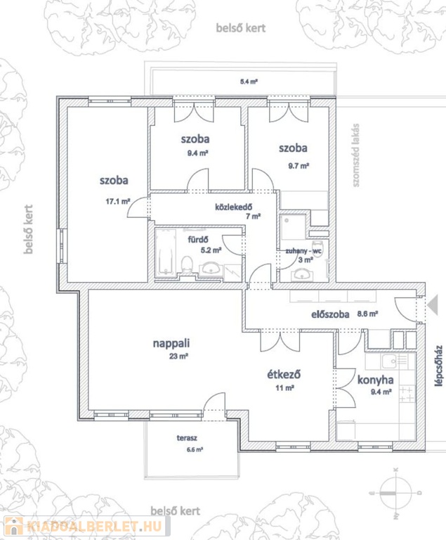 XII. MOM-Lakópark EXKLUZÍV a LAKÓPARKI BELSŐ ZÖLDKERTI épületének 4. EMELETI 4-SZOBÁS (34nm nappali és étkező tér + 3 hálószoba) 109 nm alapterületű NAPFÉNYES KLÍMÁS LUXUS LAKÁSA a nappaliból LAKÓPARKI ZÖLDKERTRE néző TERASSZAL (kb. 6,6nm), 2 szobából a lakóparki zöldkertre nyíló és sétány felé PANORÁMÁS TERASSZAL (5,4 nm), kiadó.