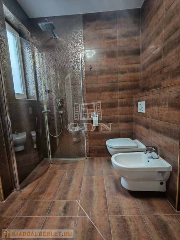Gardróbhelyiségből nyíló fürdőszoba, amely zuhanyzóval, WC-vel és bidével felszerelt.