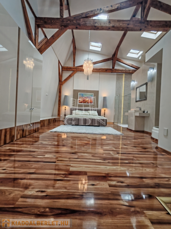 Ebből a különleges hangulatú hálószobából belső személyi lift visz fel az infraszaunához. Innen néhány lépcsővel elérhető a fából kialakított tetőterasz csodás panorámával. Tűzijáték páratlan élményt nyújt innen!