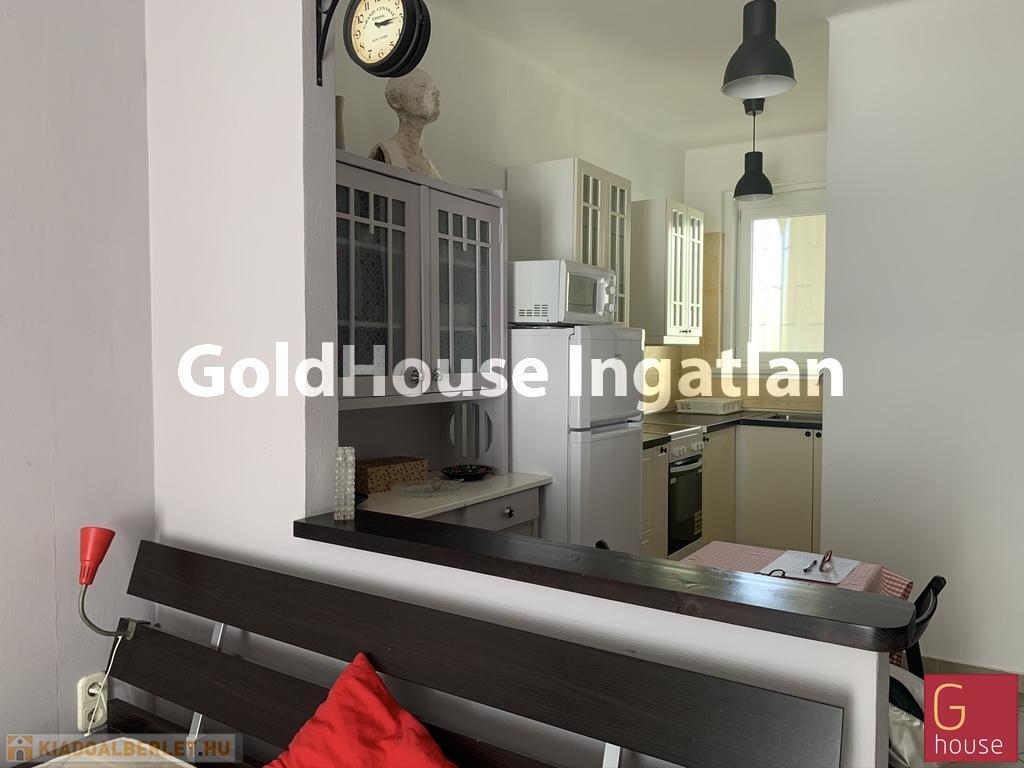 Az előtérből nyílik a modern, gépesített konyha, ahol egy kis étkezős pult is helyet kapott. Innen érhető el a világos szoba francia erkéllyel.