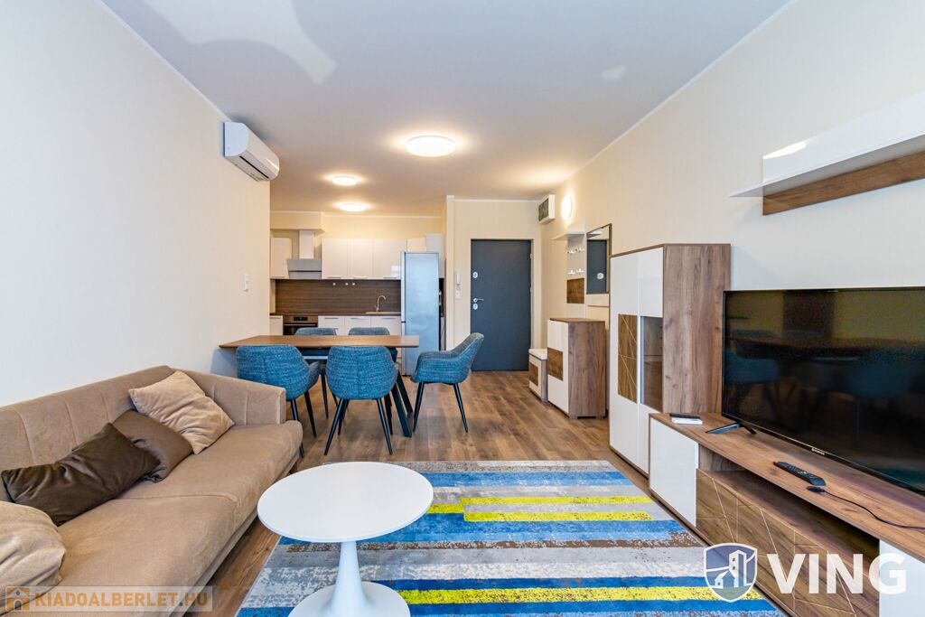 A lakás a képeken látható prémium bútorokkal és gépekkel van esztétikusan berendezve.