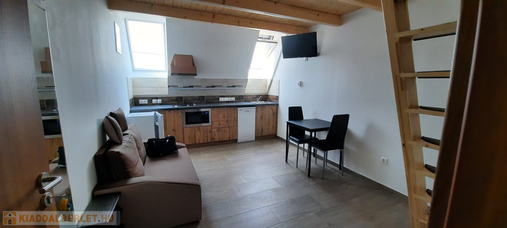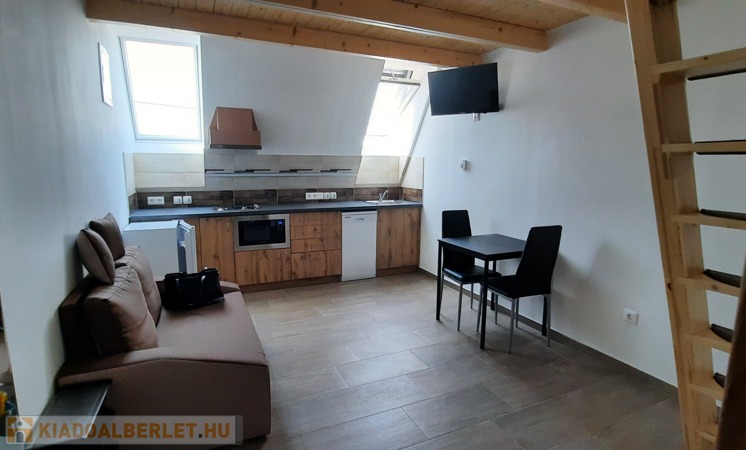 A tetőtéri lakásban a konyha teljesen felszerelt, mosogatógép, mikró, 2 lapos gáz. Az asztal, székek, hűtő, TV .
