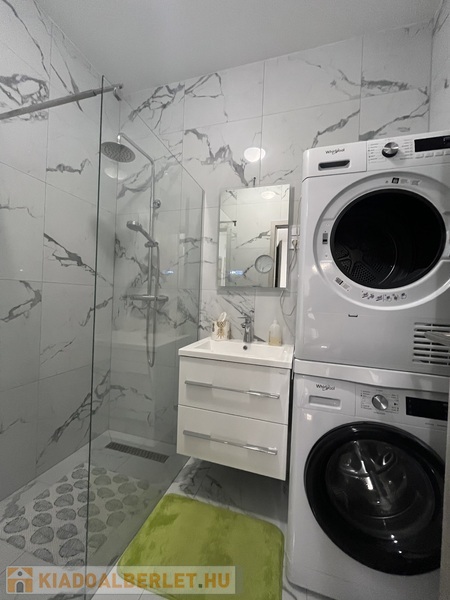 A fürdõszoba zuhanyzós, és külön, kézmosóval ellátott WC is rendelkezésre áll, ami még komfortosabbá teszi a mindennapokat. Az ingatlan teljesen bútorozott és gépesített, így tényleg csak a személyes tárgyait kell hoznia. Minden bútor és berendezés új, mivel a lakás még senki által nem lakott az építés óta.