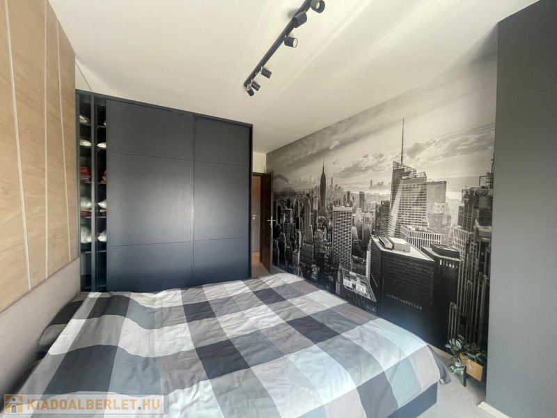 Modern liftes épület legfelső szintjén, stílusosan berendezett és teljesen gépesített lakás (nappali + háló + gardrób), egy fő vagy pár részére.